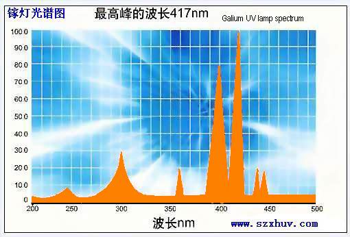 碘鎵燈是屬于UV燈的一種,碘鎵燈又稱為高壓氣體放電燈,屬于金屬鹵化物燈種類,業(yè)內(nèi)通俗稱為曬版燈、曝光燈。碘鎵燈光譜有效范圍(350nm-450nm),在波長為 350nm-450nm 范圍內(nèi)有較強的線光譜輻射,峰值417nm,功率從1KW-7KW,其燈具有壽命長、用時短、電弧穩(wěn)定,強度高曝光質(zhì)量好等優(yōu)點。