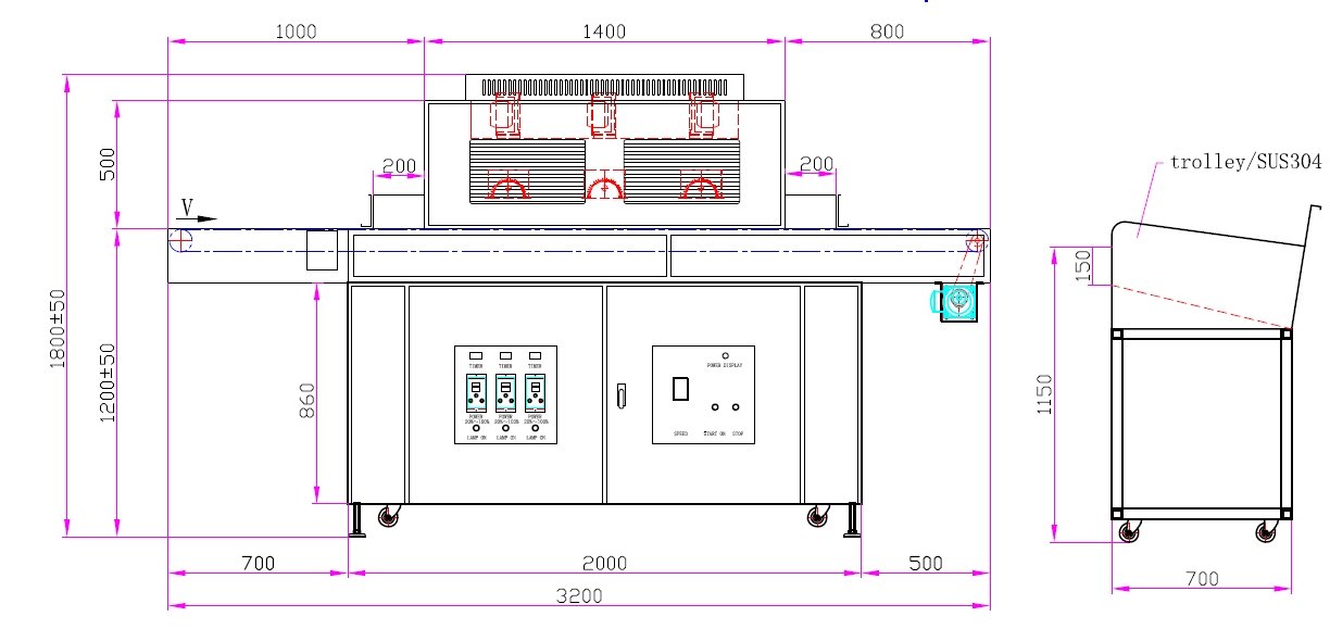 2. UV燈尺寸:總長度850毫米,弧長750毫米